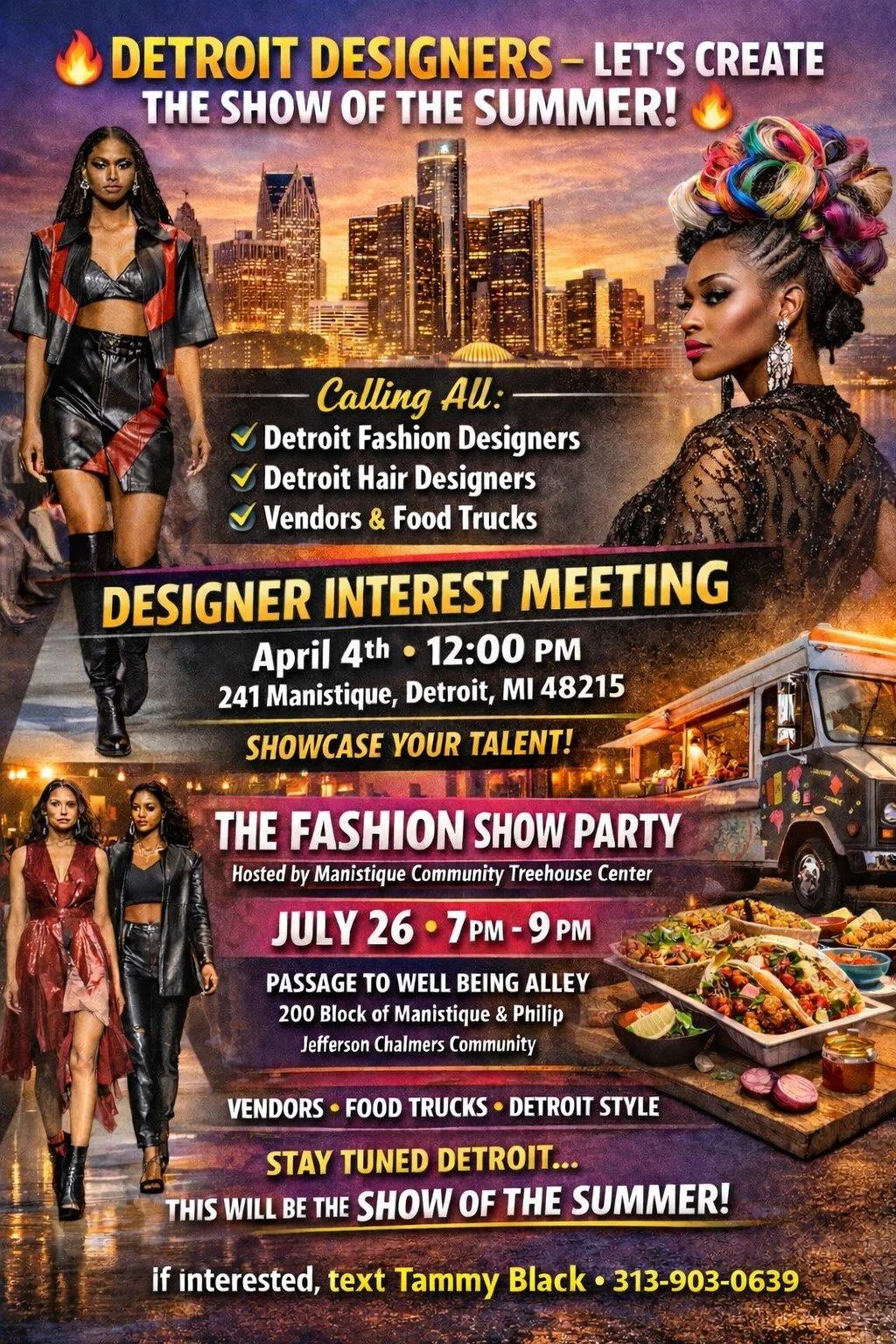 Summer Fashion Show Party Sunday, July 26, 2026 7:00 PM 9:00 PM 19:00 21:00 Manistique Community Treehouse Center's - Community Serenity Pavilion 241 Manistique Street Detroit, MI, 48215 United States (map) Google Calendar ICS